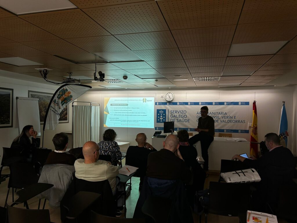 La Federación ALCER Galicia realizó este mes de febrero, en el Complexo Hospitalario Universitario de Ourense (CHUO), el taller de sexología “Abordaxe da sexualidade na ERC”. El encuentro tuvo lugar en el Aula Rosa Prol, situada en la planta 0 del nuevo edificio de las instalaciones sanitarias. Directamente vinculadas a ALCER Ourense, doce personas estuvieron presentes, recibieron la información y participaron activamente.